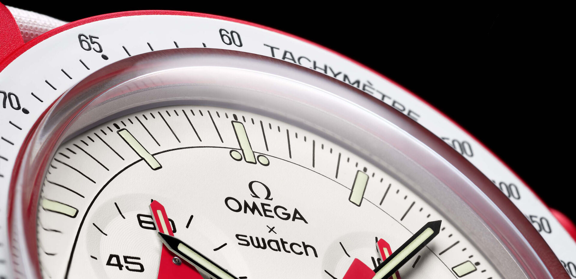 Neste relógio de edição não limitada, tons de vermelho vivo contrastam com o mostrador branco brilhante e a pulseira de VELCRO®. O ponteiro de segundos do cronógrafo é vermelho, enquanto os ponteiros do submostrador às 10 e 2 horas apresentam ponteiros vermelhos exclusivos no formato de uma nave espacial divertida, uma homenagem especial ao OMEGA Speedmaster Alaska II. O ponteiro do submostrador às 6 horas é preto, enquanto os ponteiros das horas e minutos são bicolores, preto e branco. A luneta é branca e apresenta uma escala taquimétrica preta. Todos os mostradores da coleção apresentam a marca OMEGA X Swatch, o icônico logotipo Speedmaster e o logotipo MoonSwatch. A construção em vidro de base biológica, o "S" gravado integrado ao centro do cristal, o padrão circular fino e sofisticado no anel externo do mostrador e os submostradores recuados, a construção suave e angular das asas, o icônico detalhe "ponto sobre 90" na escala taquimétrica e, claro, a exclusiva sensação biocerâmica são comuns a todos os modelos. Os ponteiros de hora, minuto e segundo do cronógrafo, bem como os ponteiros do submostrador nas posições de 10 e 2 horas e os marcadores de hora, contam com Super-LumiNova para um brilho perfeito no escuro.