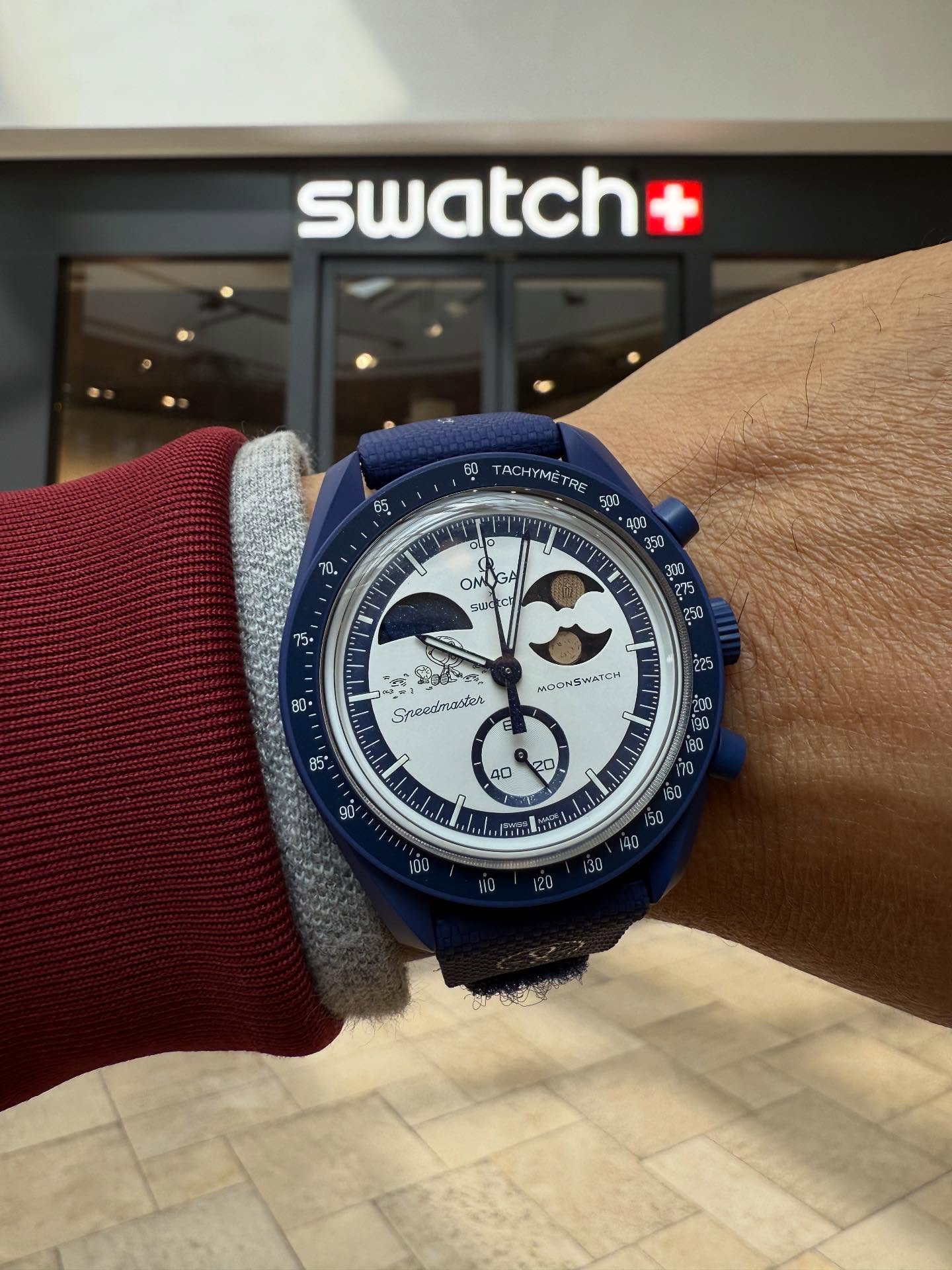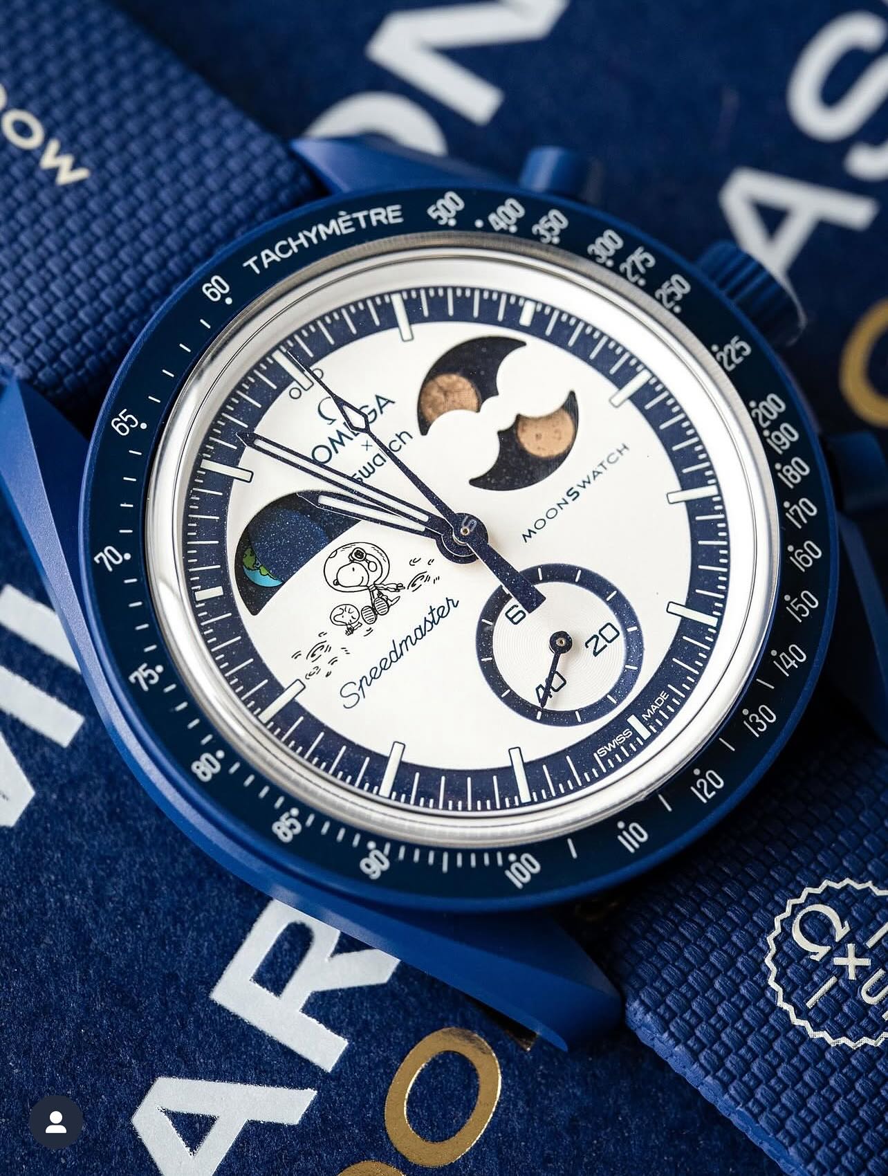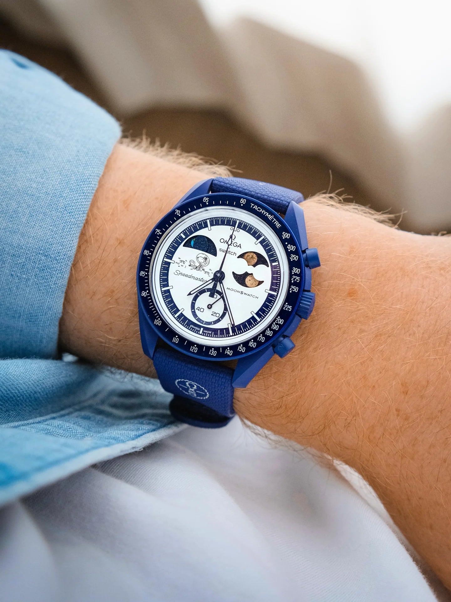 Uma homenagem à beleza do nosso planeta vista do espaço. O Earthphase apresenta um mostrador branco com as fases da Terra e da Lua, brilhos que aparecem sob luz UV e detalhes refinados em Moonshine™ Gold. Em um azul-marinho profundo, com Snoopy e Woodstock explorando o cosmos, este MoonSwatch é uma obra de arte intergaláctica e um item essencial para colecionadores.