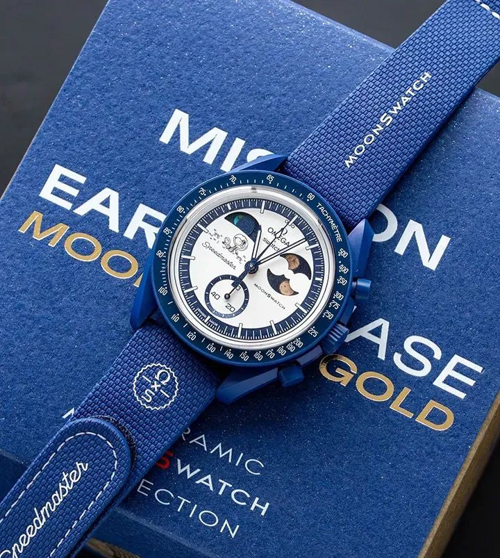 O Mission to Earthphase combina inovação e charme cósmico. Com detalhes em biocerâmica azul-marinho, mostrador branco opalino e fases da Terra e da Lua que brilham sob luz UV, ele traz o universo para o seu pulso. Os destaques incluem a aparição de Snoopy e Woodstock na Lua, bem como as luas cheias em Moonshine™ Gold. Um relógio único e poético, repleto de um toque astronômico.