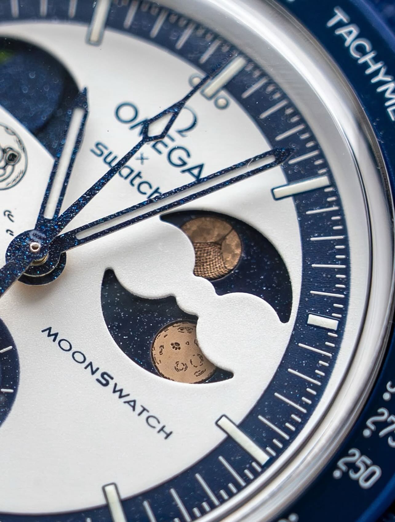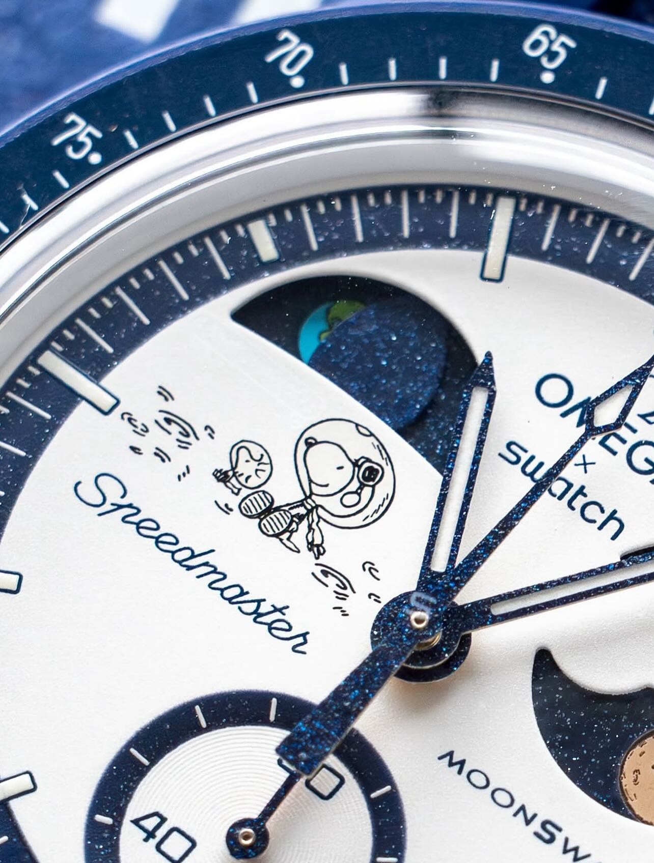 Abaixo do indicador de fase da Terra, há uma ilustração de Snoopy e Woodstock com trajes espaciais completos, observando a Terra a partir da Lua. Uma frase oculta, revelada apenas sob luz ultravioleta, evoca o espírito pioneiro do modelo Moonwatch e daqueles que ousam imaginar as coisas de forma diferente.